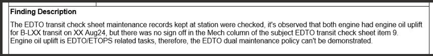 during a recent audit in one of our European line stations a finding was raised for a non-compliance on the check-sheet sign-off standards. The finding was specifically about how the engine oil servicing task was signed-off (item 9 or 10 on the A350 transit check sheet) and that a signature from a 2nd approved person is necessary (in MAD & ZRH this should be another CX approved Engineer as we don’t have any CX controlled Mechanics in your station) on the check sheet to demonstrate compliance with the EDTO dual maintenance policy.